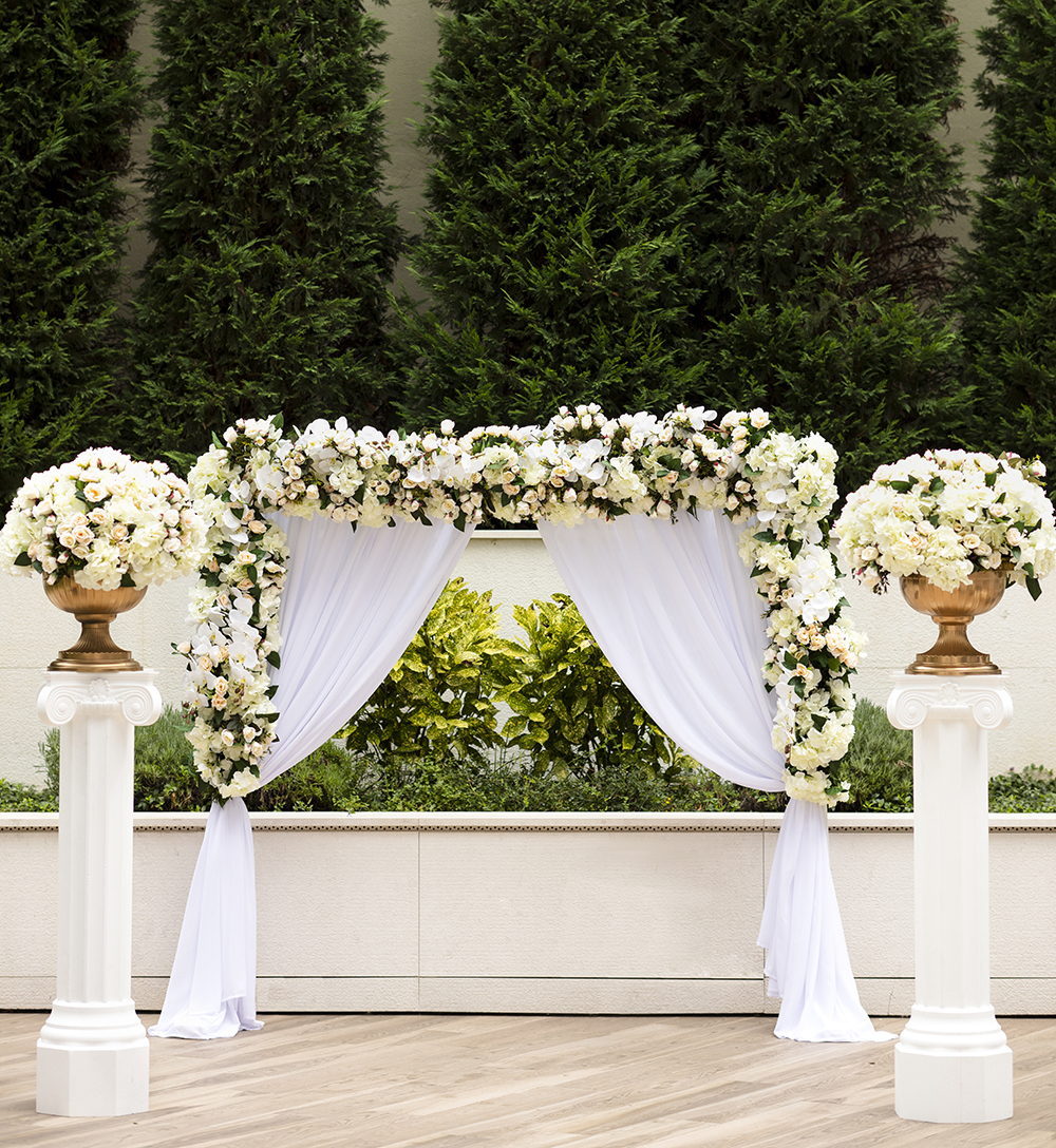 by greenery, is ideal for a romantic wedding ceremony at sunset.